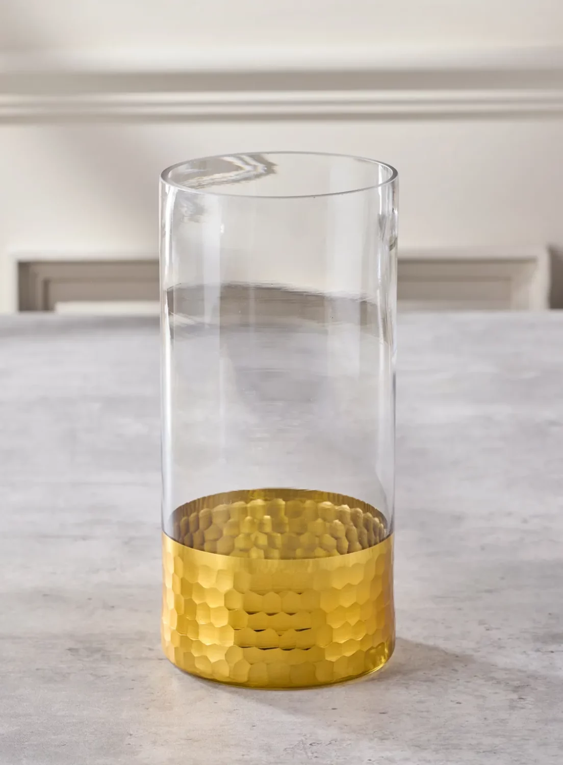 Aurora Gold Vase Double Size is a clear cylinder glass vase with a luxe hammered gold base. Perfect for larger bouquets, statement arrangements, and elegant home styling.