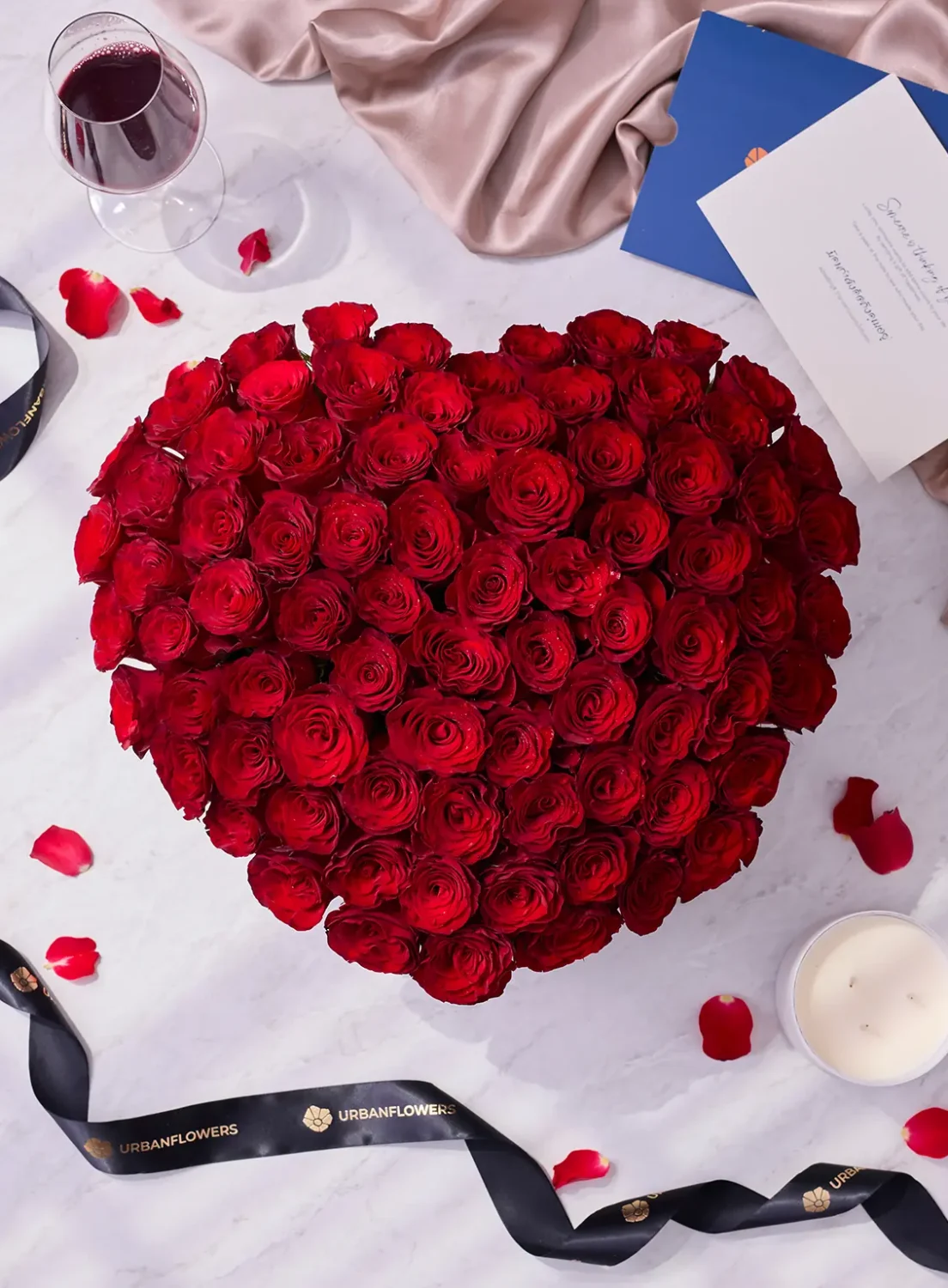 A dense bed of 100 red roses fills the heart box, creating a striking display that combines modern style with classic romance.