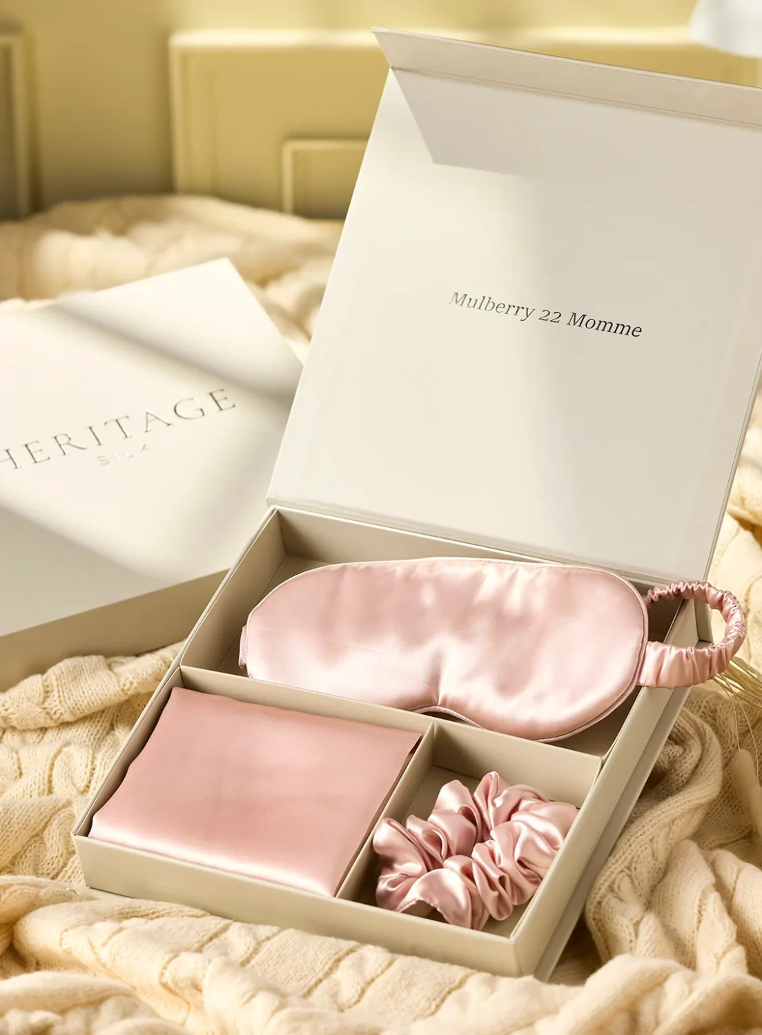 The Heritage Silk Eye Mask Set in Rose Gold turns nightly rest into ritual. Made from 22 momme pure mulberry silk, it includes a matching pillowcase and silk hair tie — a trio designed to protect skin, hair, and serenity in equal measure.