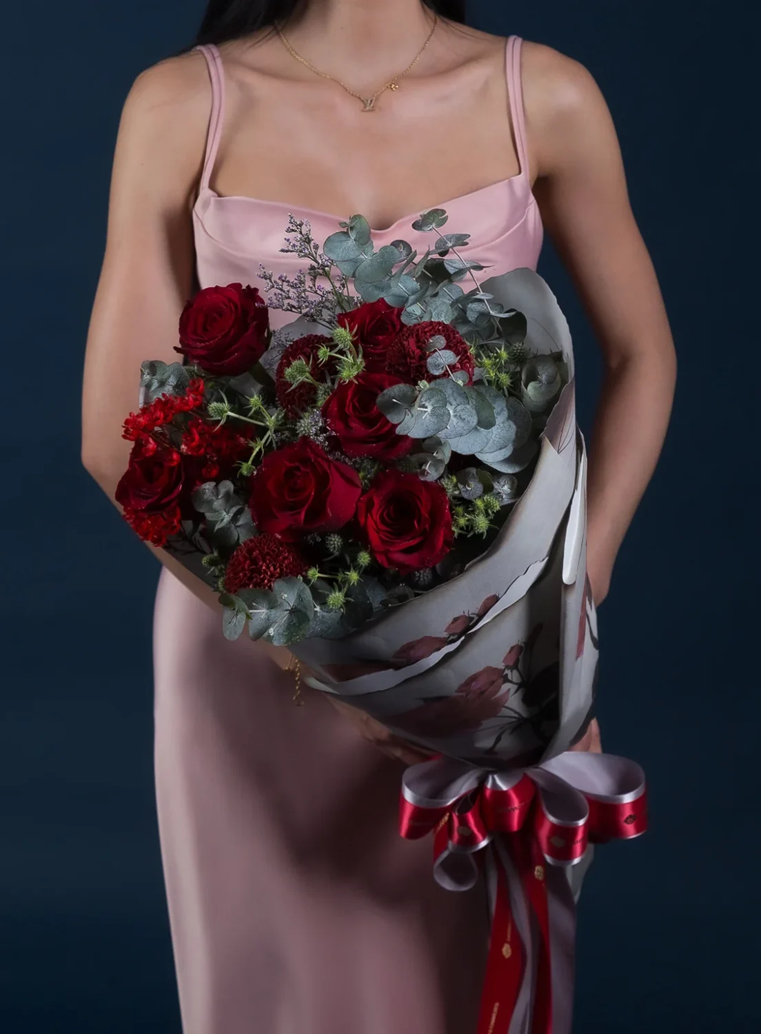 This captivating arrangement features premium red roses, red chrysanthemums, and silver eucalyptus, symbolizing deep affection and loyalty. Wrapped in art-print paper and finished with red satin ribbons, Lady in Red radiates both strength and sensuality.