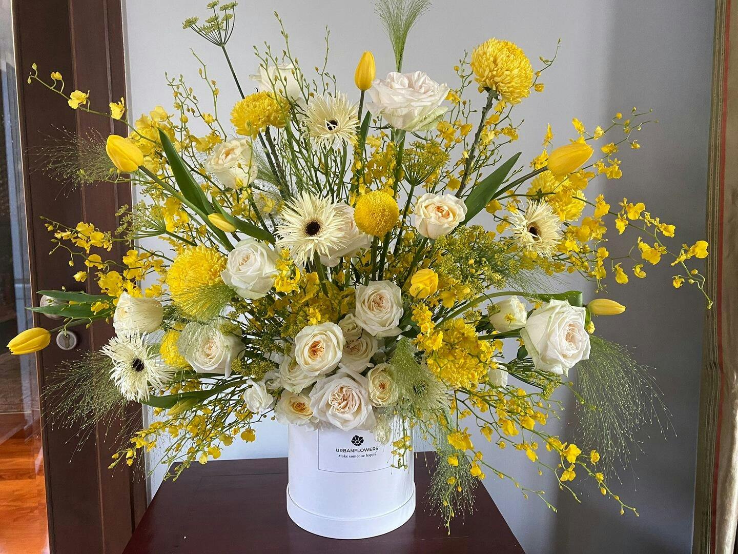 This vibrant flower box takes its inspiration to the sweet, slightly sour and very vibrant dessert of the same name. Lemon sherbet is a popular frozen treat that has been enjoyed by people of all ages for centuries. Like the sweet treat, the Lemon sherbet flower box is light and uplifting. This stunning floral arrangement instantly brings joy and makes a great centrepiece for any room.