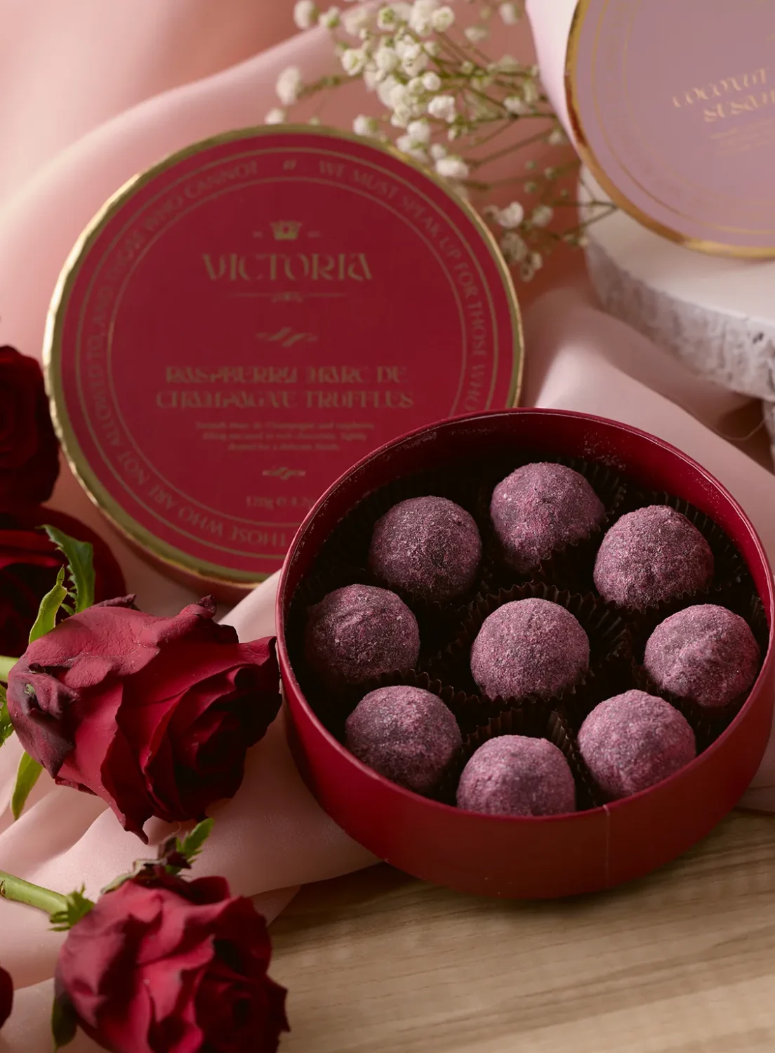 Refined, celebratory, and unforgettable — Victoria Raspberry Marc de Champagne Truffles combine the sophistication of fine Belgian chocolate with the fruity brightness of raspberries and the subtle aroma of Marc de Champagne. Handcrafted by our chocolatiers in Bangkok, each truffle is rolled in delicate raspberry powder and presented in Victoria’s signature crimson round box with gold accents. A luxurious 9-piece collection, perfect for gifting or indulging in life’s sweetest moments.