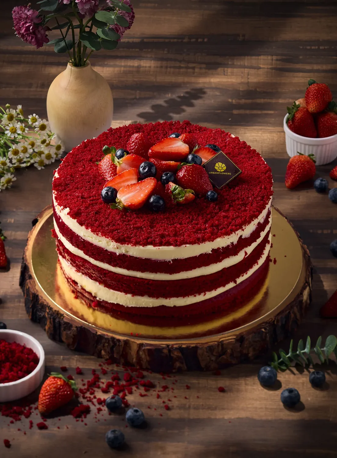 A timeless American classic reimagined with UrbanFlowers’ handcrafted touch. Our Red Velvet Cake combines rich cocoa-infused sponge with smooth cream cheese frosting for the perfect balance of sweetness and tang. Finished with fresh strawberries and blueberries, this cake is strikingly elegant — soft, velvety, and unforgettable.