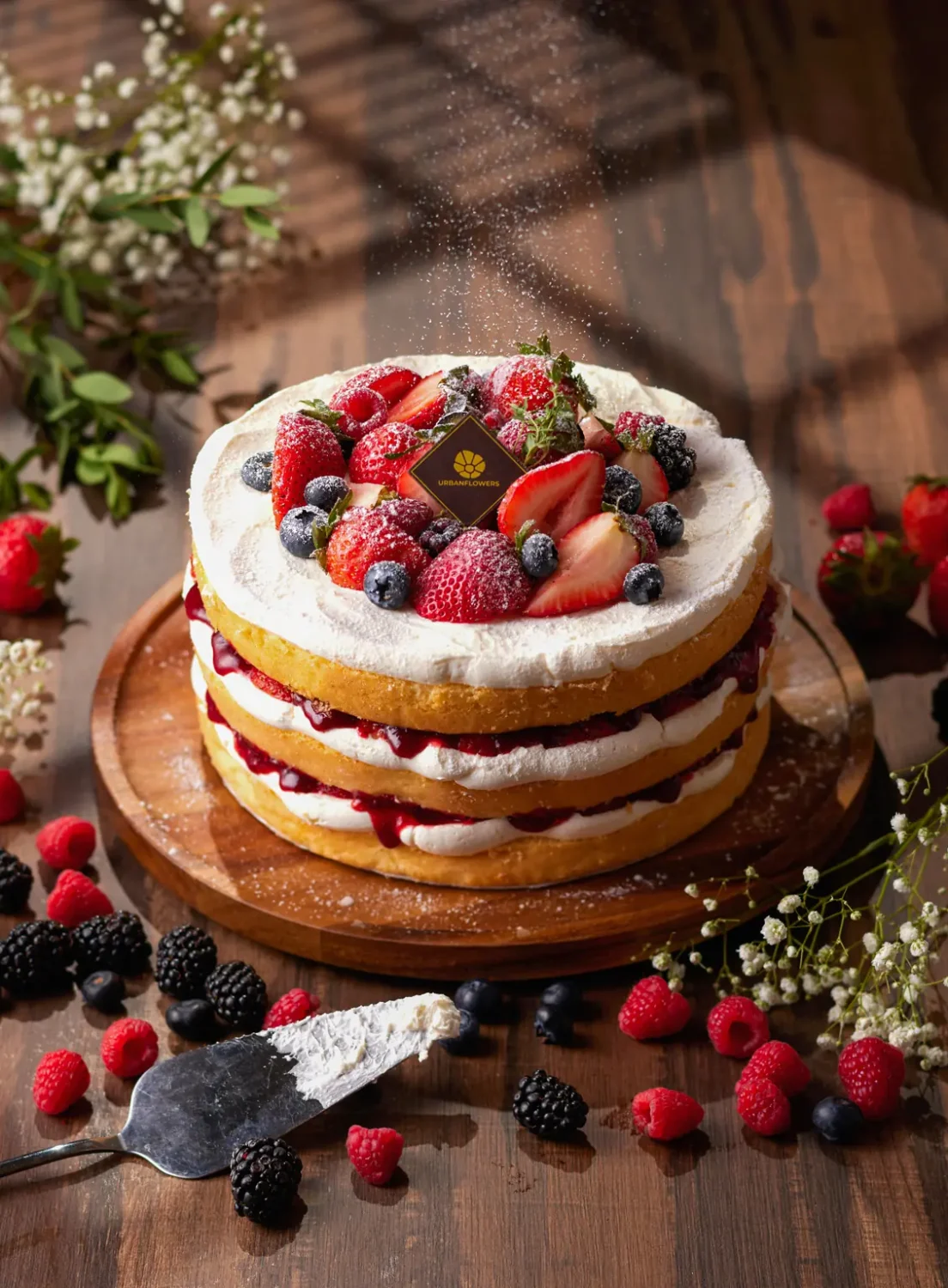 A celebration of sweetness and freshness layers of soft vanilla sponge, fresh cream, and real strawberries. Our Strawberry Cake is a modern classic that combines light vanilla sponge with rich layers of diplomat cream — a smooth, airy blend of pastry cream and whipped cream that melts on the tongue. Each layer is filled with fresh strawberries and strawberry jam for a perfect balance of sweetness and tang. Finished with fresh whipping cream, assorted berries (strawberries, raspberries, blueberries), and edible flowers, this cake is as beautiful as it is delicious — ideal for birthdays, anniversaries, or intimate gatherings.