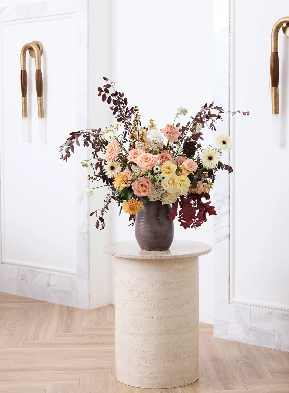 The design celebrates natural elegance through layered tones and textures. Soft peach and ivory roses anchor the arrangement, while golden-hued blooms and dark foliage create a warm interplay of light and shadow. Each stem is arranged organically to mirror the relaxed rhythm of nature — graceful, airy, and full of life. The artisan-crafted vase adds tactile sophistication, its subtle ridge and glaze catching light beautifully.The design celebrates natural elegance through layered tones and textures. Soft peach and ivory roses anchor the arrangement, while golden-hued blooms and dark foliage create a warm interplay of light and shadow. Each stem is arranged organically to mirror the relaxed rhythm of nature — graceful, airy, and full of life. The artisan-crafted vase adds tactile sophistication, its subtle ridge and glaze catching light beautifully.