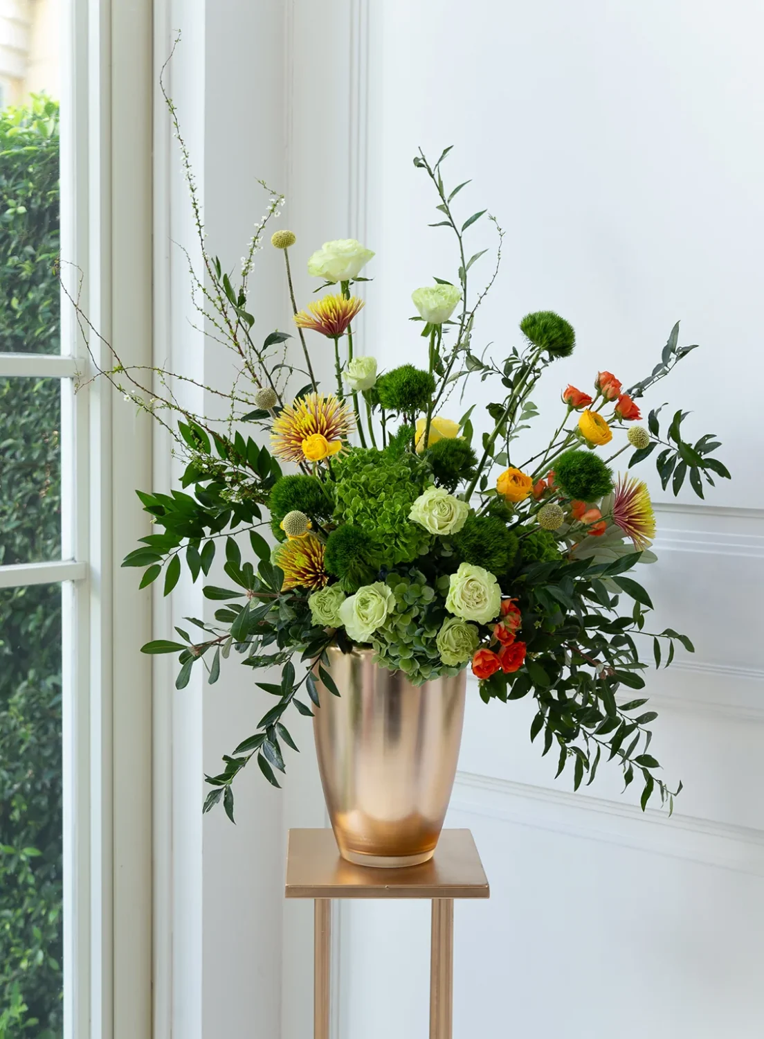 This design combines rich green tones with warm amber highlights for a naturally balanced, modern look. Each bloom is positioned to emphasize height and movement — from delicate branches reaching upward to lush hydrangea clusters that anchor the design.