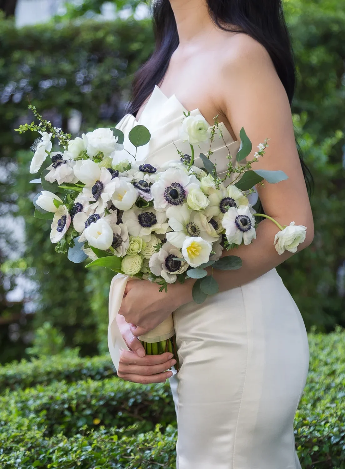 Handcrafted by UrbanFlowers Bangkok florists, Unconditionally is inspired by the beauty of modern garden weddings. The contrast of black-centered anemones against soft white tulips and ranunculus creates visual depth, while eucalyptus adds a touch of freshness and fluidity. This bouquet’s natural, flowing structure represents love that is pure, expressive, and everlasting — just like its name.