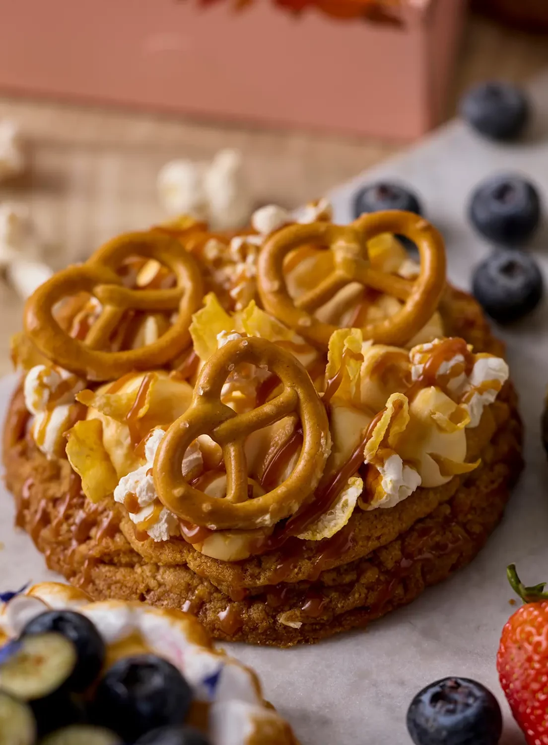 The Victoria Corn Cashew Cookie is a fun, indulgent fusion dessert combining buttery corn sweetness with nutty cashews and salty crunch. The cookie base is rich with real corn flavor, golden, soft, and slightly chewy. Roasted cashews add warmth and nuttiness, while the topping steals the show — salted pretzels, crunchy popcorn, and a silky caramel drizzle. Every bite gives a playful mix of textures: sweet, salty, crunchy, soft, nutty, and buttery. It’s nostalgic, comforting, and uniquely delicious — like a dessert inspired by a movie-night snack mix, elevated to gourmet quality.