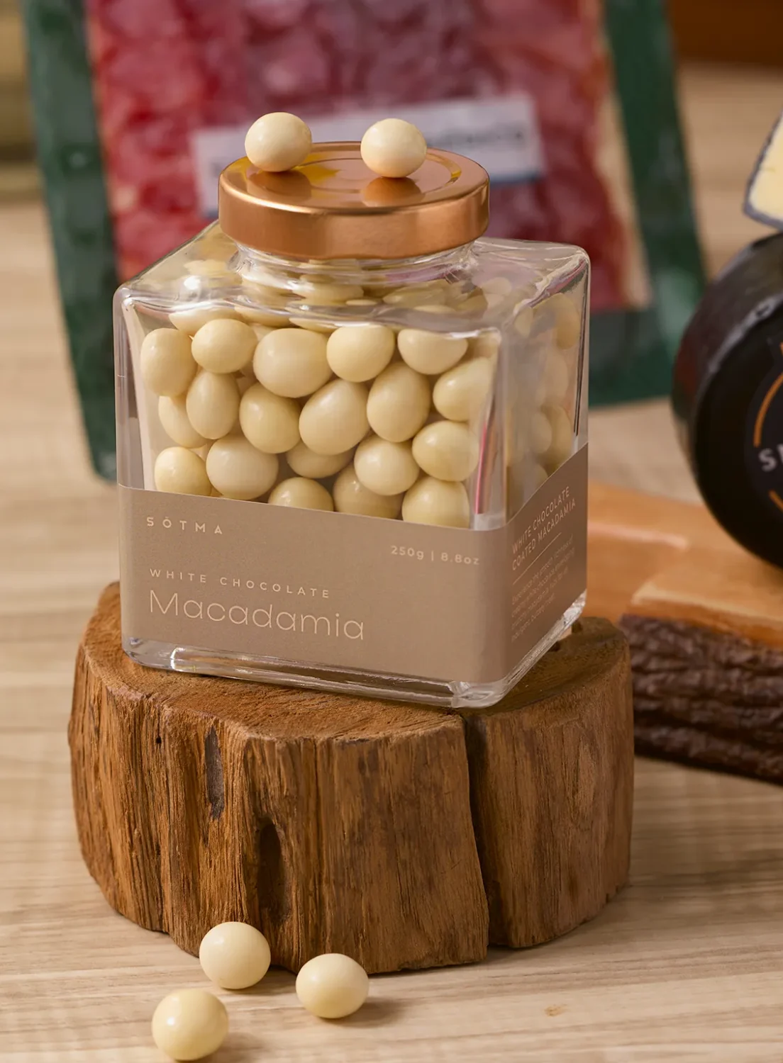 Delight in creamy perfection with Sötma White Chocolate Macadamia, handcrafted in Bangkok by UrbanFlowers’ chocolatiers. Each roasted macadamia is gently enrobed in layers of smooth Belgian white chocolate using the traditional panning method for a glossy, melt-in-your-mouth finish. Presented in Sötma’s signature glass jar with a rose-gold lid, this elegant confection balances nutty crunch with delicate sweetness — a true luxury in every bite.