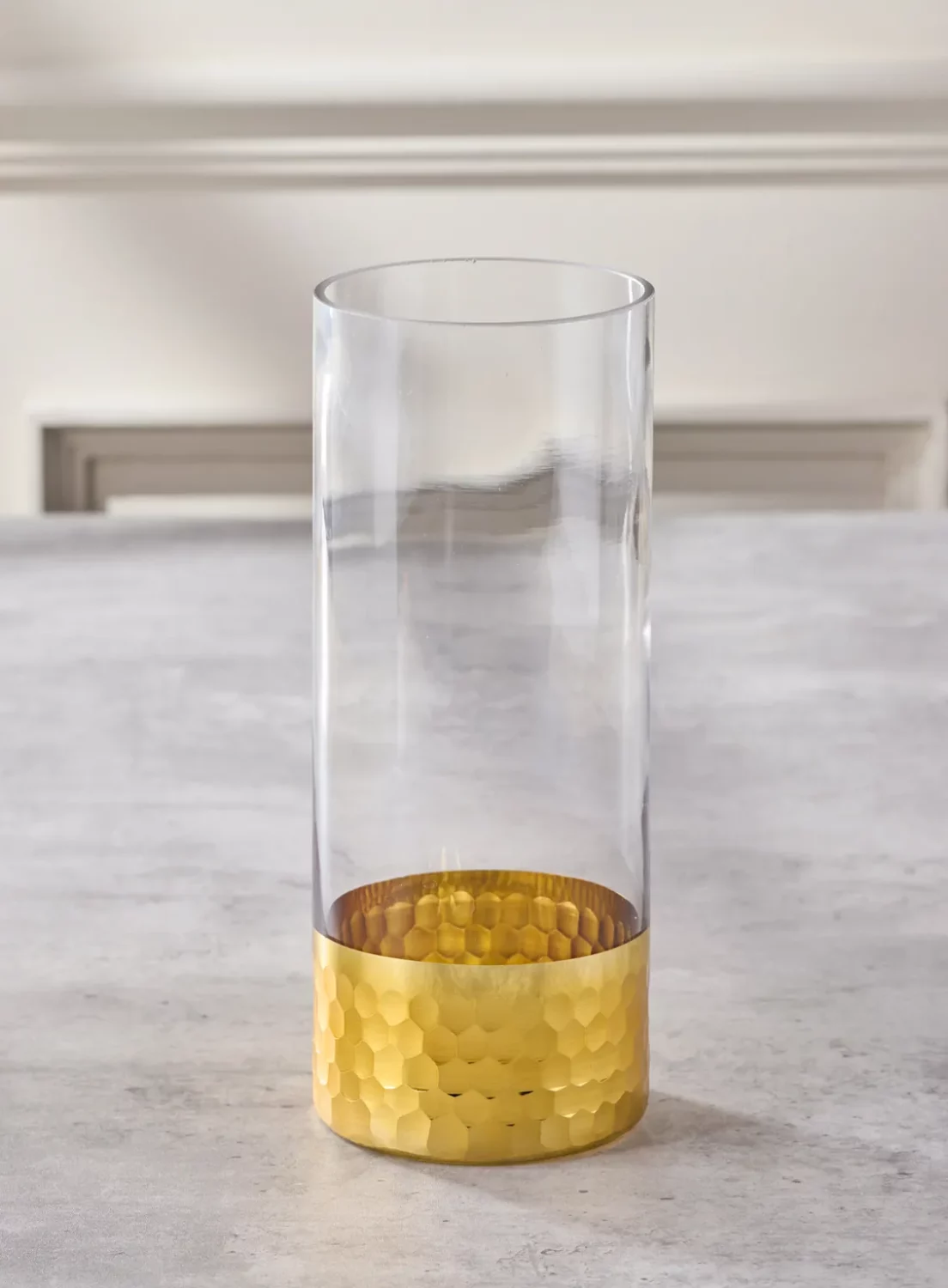 Aurora Gold Vase หรือแจกันแก้วใสฐานทอง ขนาดเล็กทรงกระบอกพร้อมฐานทองลายค้อนสุดหรู เหมาะสำหรับใส่ช่อดอกไม้ กุหลาบ และตกแต่งบ้านให้ดูพรีเมียมแบบมินิมอล