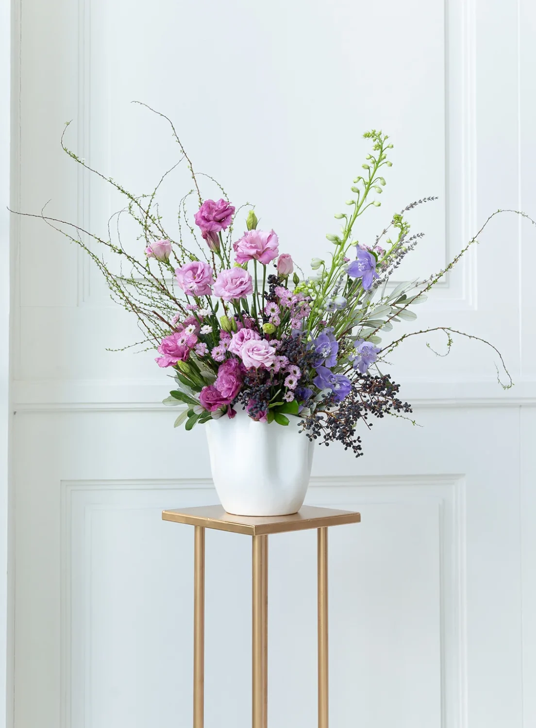 Lavish Hills ถ่ายทอดเสน่ห์แห่งความสงบและความหรูหราในแบบธรรมชาติ ผ่านโทนสีม่วงอ่อนและน้ำเงินที่สบายตา ดอกลิซิแอนทัส แอสเตอร์ และเดลฟีเนียมถูกร้อยเรียงอย่างนุ่มนวล ให้ความรู้สึกเหมือนยามเช้าที่มีสายลมพัดผ่านสวนเขา