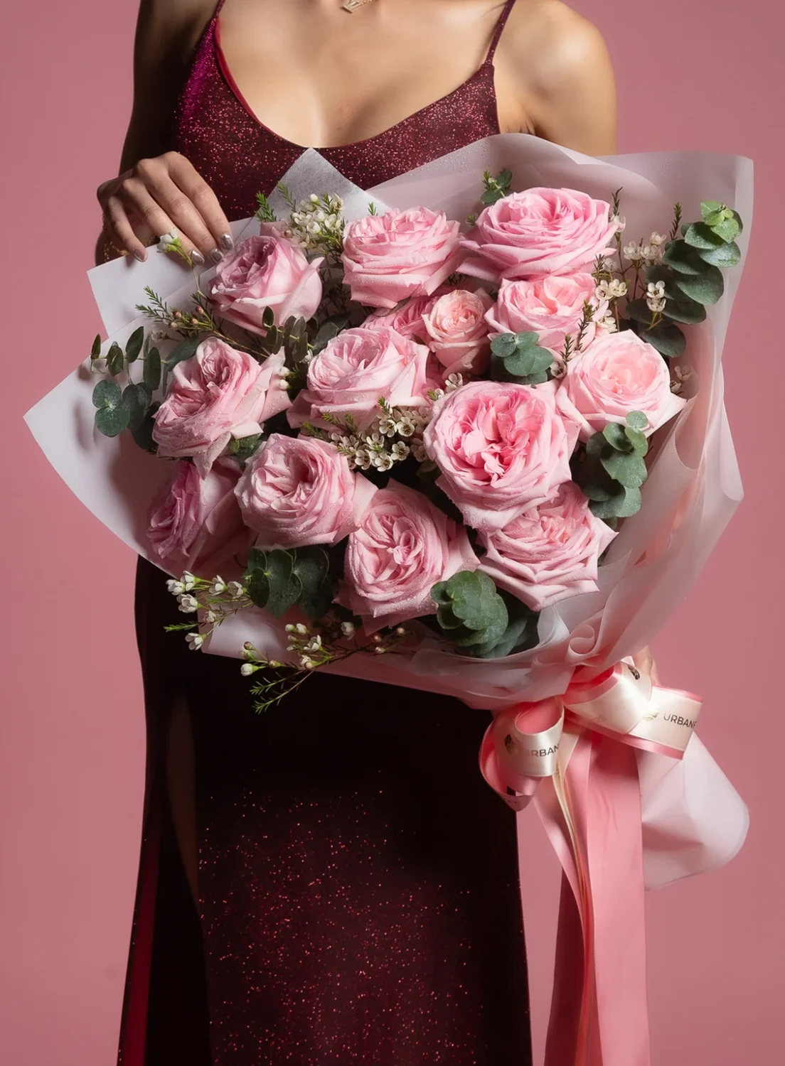 ช่อดอกไม้เลิฟ เลตเทอร์ ผสมผสานเฉดชมพูอ่อนกับความเป็นธรรมชาติของใบไม้ สร้างความรู้สึกอบอุ่นและโรแมนติกในเวลาเดียวกัน กุหลาบชมพูสื่อถึงความรักและความชื่นชม ส่วนใบยูคาลิปตัสช่วยเพิ่มความสดใสและสมดุลให้กับช่อได้อย่างลงตัว