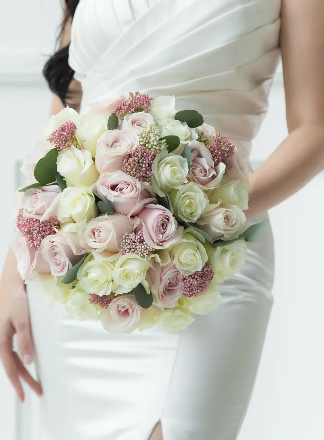 ช่อ Sapphire จัดด้วยดอกกุหลาบคัดพิเศษในโทนสีชมพูบลัชและงาช้างเรียงตัวอย่างสมดุล แทนความรักที่มั่นคงและยั่งยืน เสริมด้วยใบยูคาลิปตัสและเบอร์รี่ชมพูให้ดูละมุนและมีมิติ เหมาะกับงานแต่งทุกสไตล์ ตั้งแต่งานในโบสถ์สุดคลาสสิกไปจนถึงงานแต่งกลางสวนที่อบอุ่น